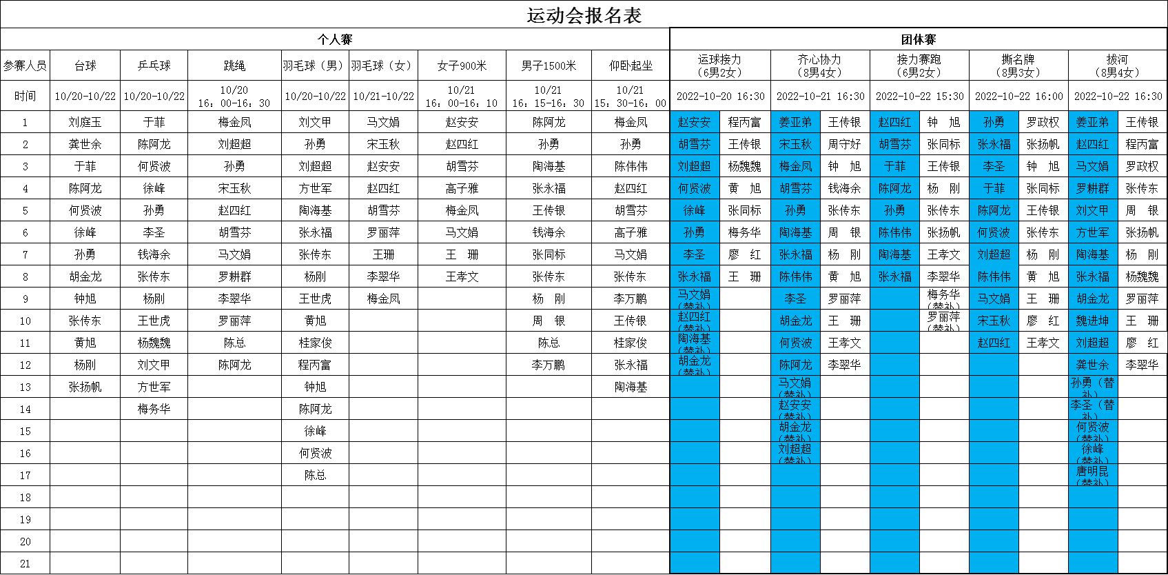 金秋送爽、丹桂飄香,在這秋高氣爽的美好時(shí)節(jié),我們滿懷喜悅的心情迎來了公司2022年度秋季職工運(yùn)動(dòng)會(huì)。本屆運(yùn)動(dòng)會(huì)分個(gè)人賽、團(tuán)體賽,自10月20日至22日共持續(xù)3個(gè)下午,比賽項(xiàng)目包括乒乓球、羽毛器(男子、女子單項(xiàng))、臺(tái)球、跳繩、仰臥起坐、女子900米,男子1500米長跑8項(xiàng)個(gè)人賽,還有齊心協(xié)力、運(yùn)球接力、女子接力賽、男子接力賽、撕名牌、拔河共6項(xiàng)團(tuán)體賽。在歷屆運(yùn)動(dòng)會(huì)的賽程、賽項(xiàng)上都增加了新的活動(dòng)亮點(diǎn),從參賽名單上不難看出,全體協(xié)普家人的熱情和參與度都異常高漲。