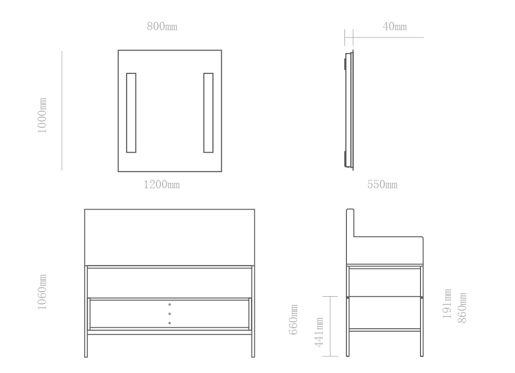 尺寸:化妝鏡 800X1000X40 (mm) + 浴室柜1200X550X1060  (mm)